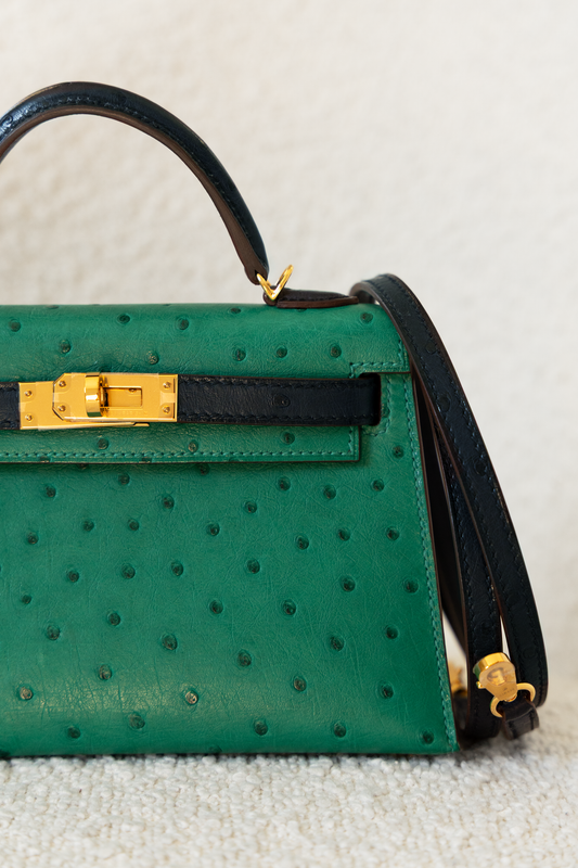 Hermès Mini Kelly Ostrich in Vert Vertigo/Blue Iris GHW