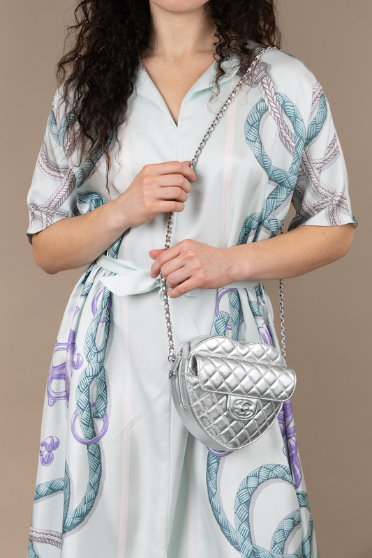 Hermes "Palefroi Remix" Silk Caftan in Blanc Nacre & Chanel Metallic Silver Heart Bag
