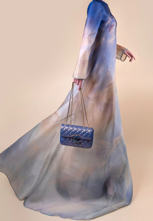 فستان زيمرمان تاما باياس سليب بلون فانيلا سكاي مع حقيبة شانيل سي سي المعدنية ذات الغطاء
