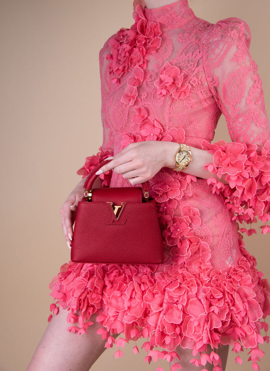 فستان زيمرمان متوسط الطول من الدانتيل باللون الليموني مع حذاء هيرميس كيلي 25 كروك باللون الوردي بوربر وحذاء ماش آند ماش بكعب عالٍ مدبب بفيونكة مزدوجة باللون الفوشيا