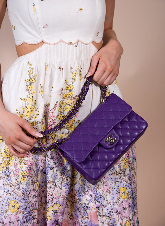 فستان زيمرمان جود سكالوب متوسط الطول مع حقيبة شانيل أرجوانية قابلة للطي