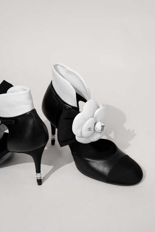 حذاء شانيل ماري جينس بكعب عالٍ باللونين الأسود والأبيض