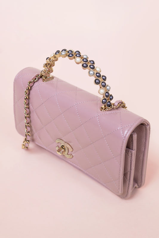 محفظة شانيل باللون الوردي الفاتح مع مقبض وسلسلة