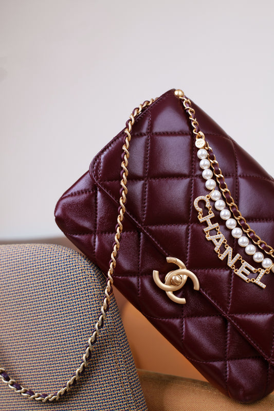 حقيبة شانيل متوسطة الحجم باللون العنابي مزودة بسلسلة من اللؤلؤ "شانيل"