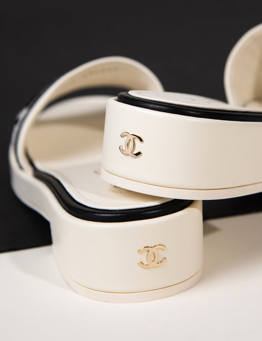 حذاء شانيل مفتوح من الخلف بأحجار كريمة وردية/سوداء