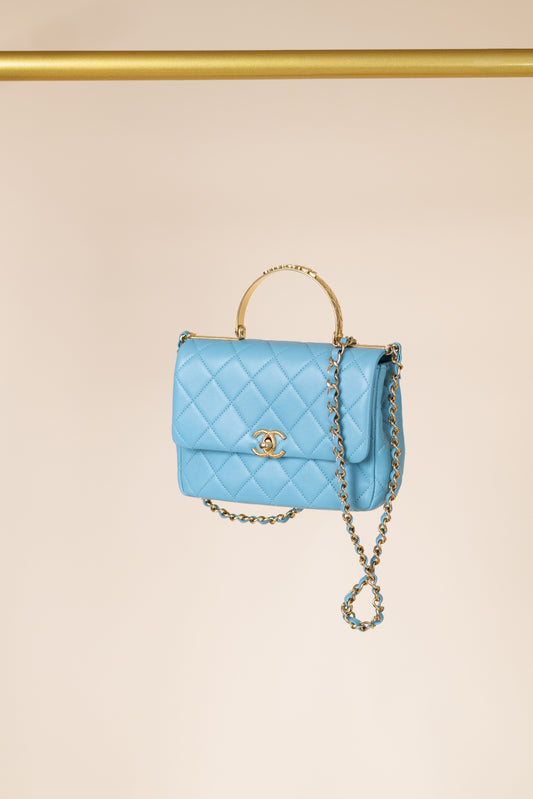 حقيبة شانيل صغيرة بمقبض علوي باللون الأزرق الفاتح