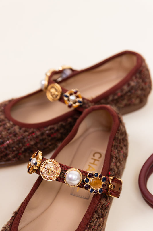 حذاء شانيل تويد ماري جين باللون البني/الأحمر