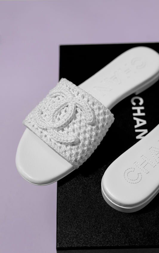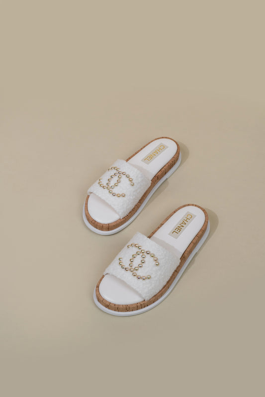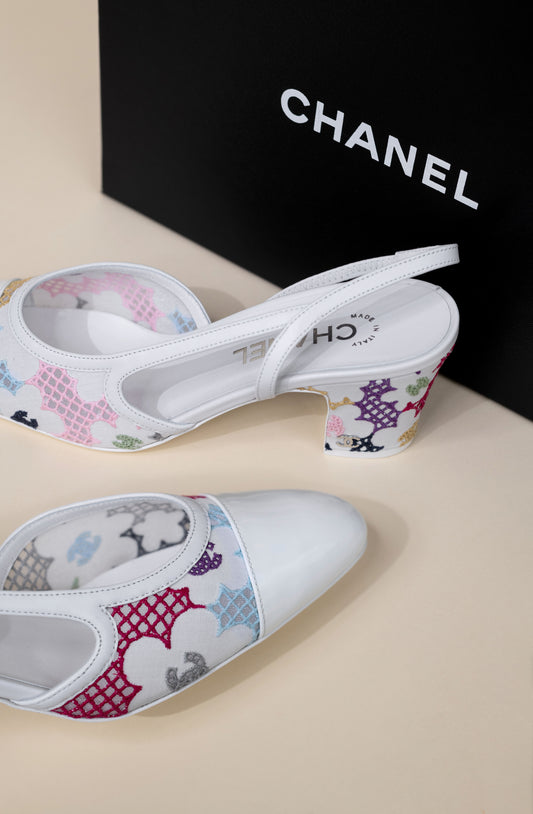 حذاء شانيل مفتوح من الخلف مزين بالزهور باللون الأبيض