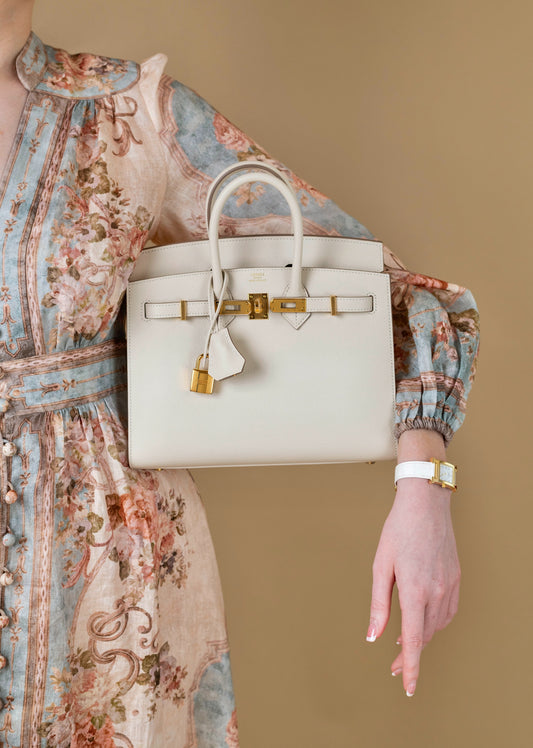 Hermès Birkin 25 Epsom Sellier Craie GHW with Heure H Watch 25mm White Alligator Strap