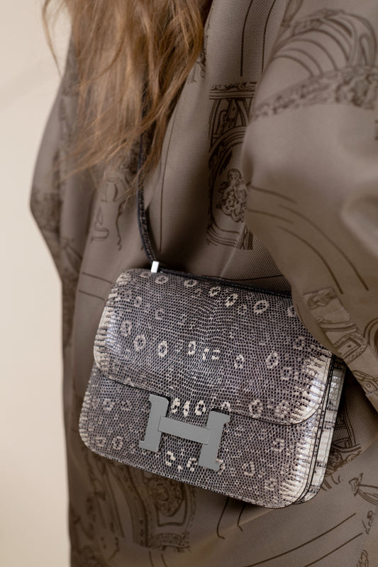 Hermès Chemise Masculine Imprimé En Désordre Finesse Top & Pants in Gris/Étoupe with Mini Constance Ombré Lizard