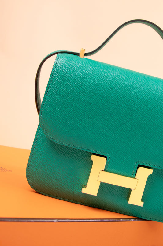 حقيبة هيرميس كونستانس 24 لامعة من جلد التمساح باللون الأخضر الزمردي