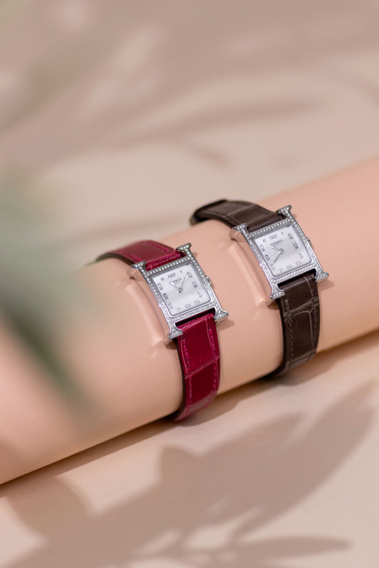 Hermès H Heure Watches 21mm in Shiny Alligator Hot Pink & Gris Elephant