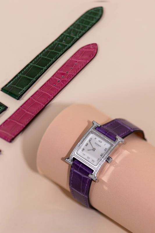 Hermès H Heure Watch 25mm in Shiny Alligator Straps in Vert Fonce, Violet, & Hot Pink