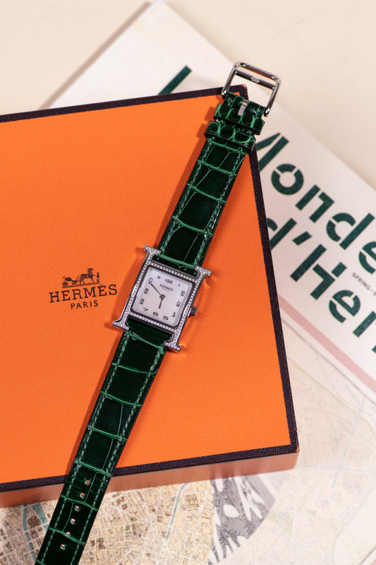 Hermès H Heure Watch with Diamonds & Green Shiny Crocodile Strap
