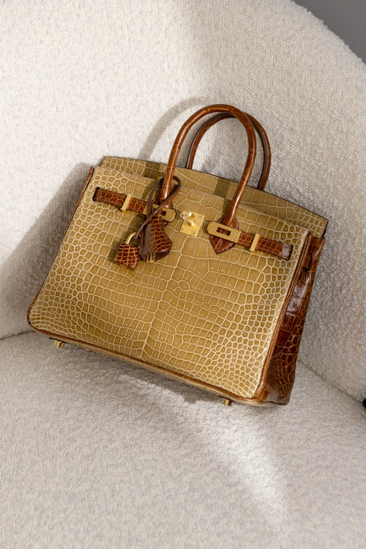 حقيبة هيرميس HSS بيركين 25 لامعة من جلد التمساح باللون البيج السمور/العسل GHW