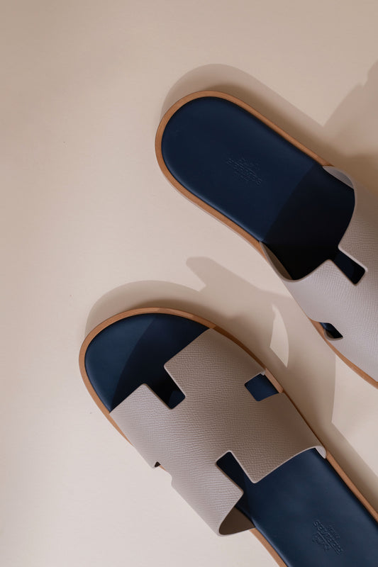 Hermès Izmir Sandals in Blanc Gomme/Bleu Celeste
