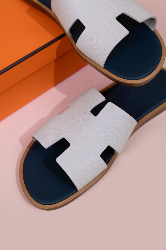 Hermès Izmir Sandals in Blanc De Paris / Bleu Céleste