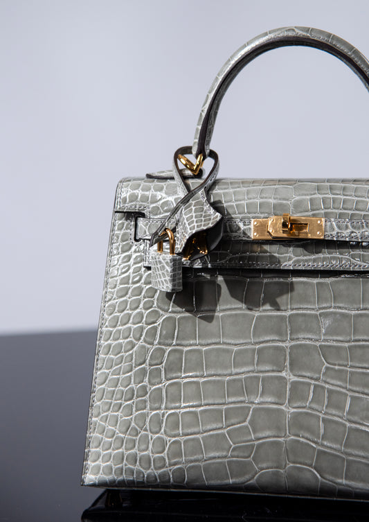 Hermès Kelly 25 Shiny Alligator in Gris Cement GHW