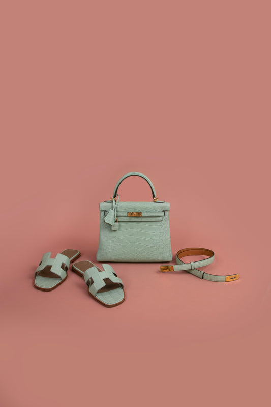 Hermès Kelly 25 Matte Alligator with Kelly Belt & Oran Sandals in Vert D'eau