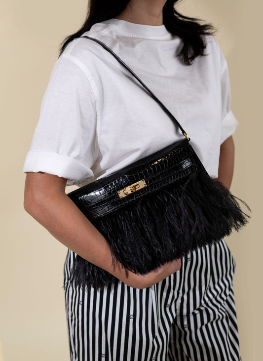 حقيبة هيرميس كيلي إيلان سوداء لامعة من جلد التمساح مع ريش النعامالسعر العادي $0.00 USDالسعر العاديسعر الوحدة / لكل-