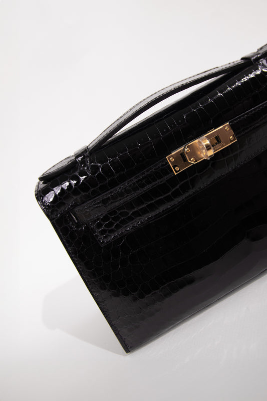 Hermès Kelly Pochette Shiny Alligator Black Ghw