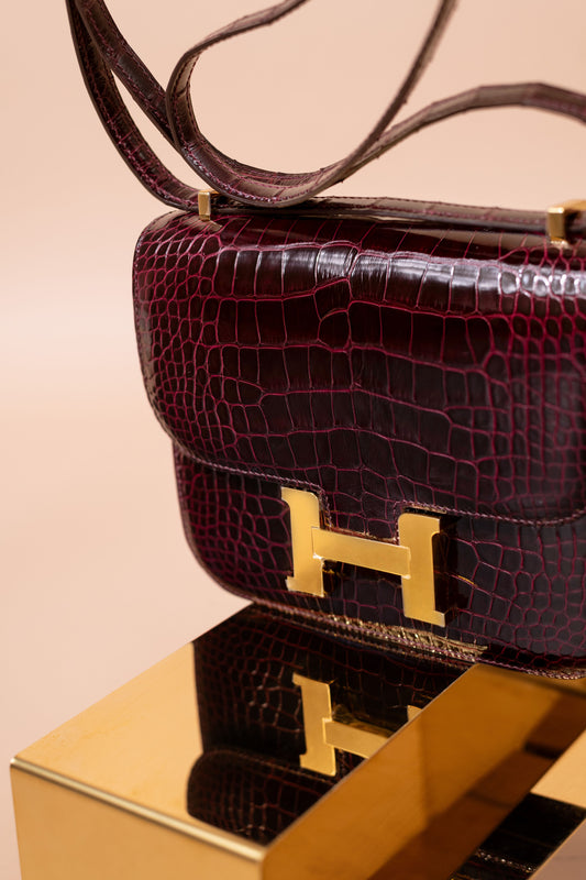 Hermès Mini Constance Shiny Alligator in Bordeaux GHW