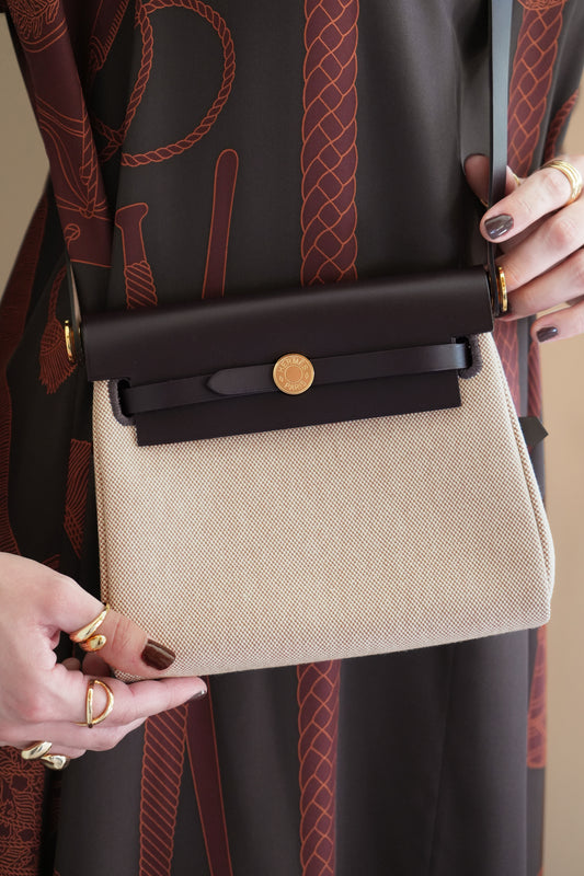 Hermes Mini Herbag in Ebene/Ecru with Gold Hardware