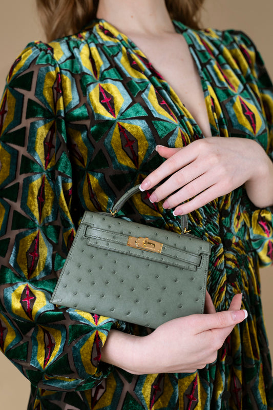 Hermès Mini Kelly 20 Ostrich in Vert Amande GHW
