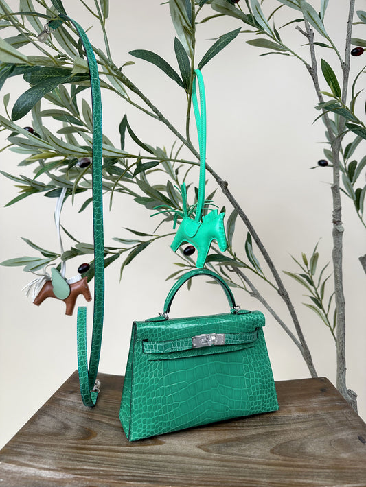 حقيبة هيرميس ميني كيلي 20 من جلد التمساح اللامع باللون الأخضر اليشم PHW