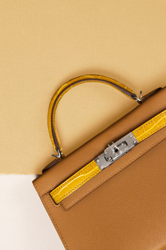 Hermès Mini Kelly 20 Touch Shiny Alligator Epsom in Sesame/Jaune Ambre PHW