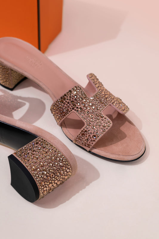 صندل هيرميس أواسيس المخملي/المرصّع بالكريستال بلون البيج