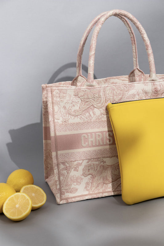 حقيبة حمام هيرميس الصفراء مع حقيبة ديور بوك توت باللون الوردي الفاتح/الأبيض