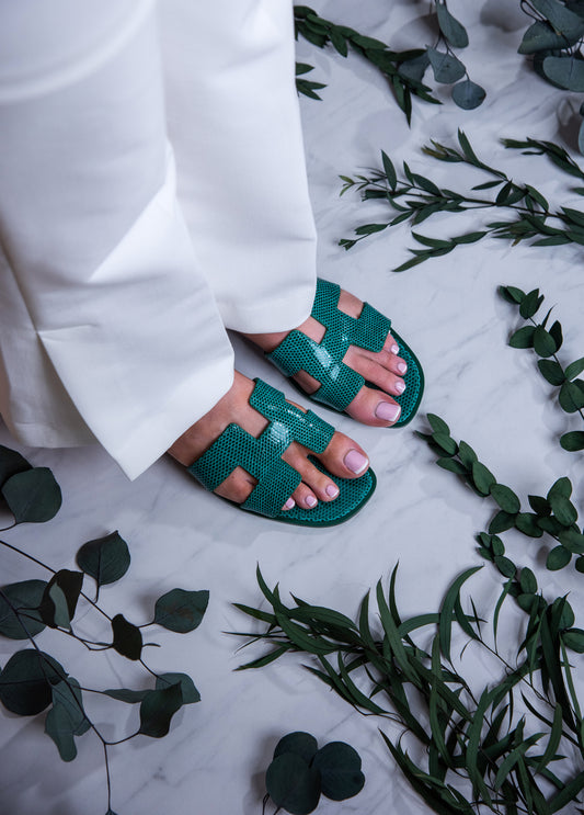 Hermès Oran Lizard Sandals in Vert Émeraude