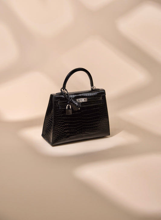 Hermès Kelly 25 Black Shiny Crocodile PHW with Valentino Crepe de Chine Logo Midi Dress