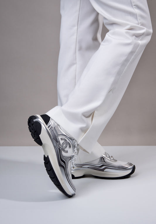 Chanel - Metallic Silver/White CC Sneakers