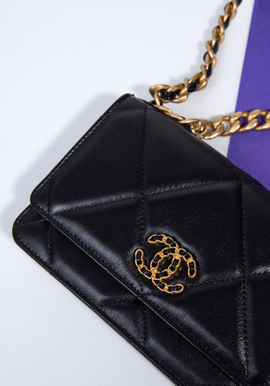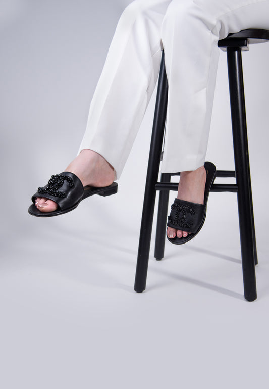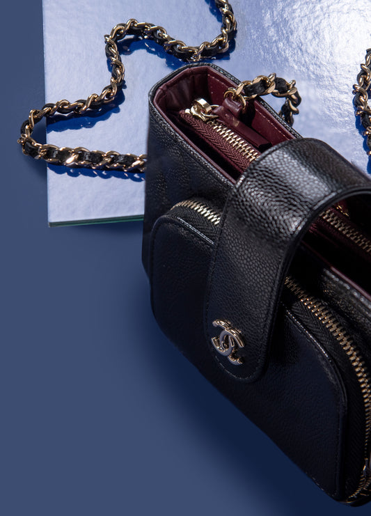 شانيل - محفظة هاتف سوداء مع سلسلة وصندل بقفل CC أسود