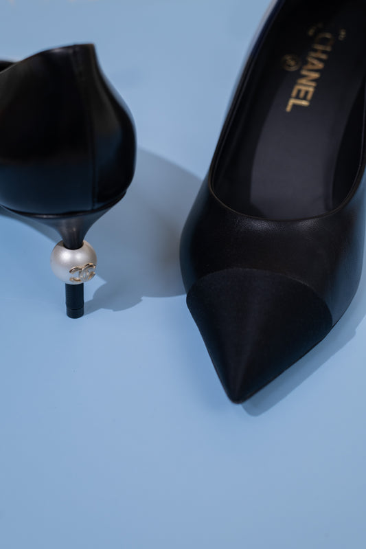 حذاء شانيل مفتوح من الخلف باللون الأسود اللؤلؤي وحقيبة صغيرة سوداء مقاس 31 مع سلسلة