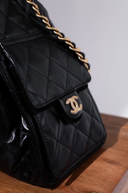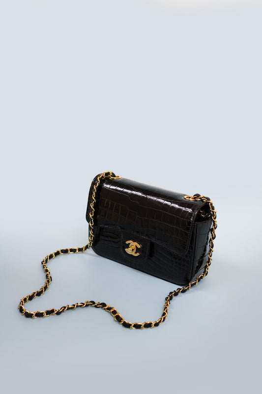 حقيبة شانيل سوداء صغيرة قابلة للطي من جلد التمساح اللامع
