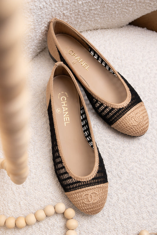 حذاء باليه مسطح من شانيل CC مصنوع من الرافيا باللون البيج/الأسود