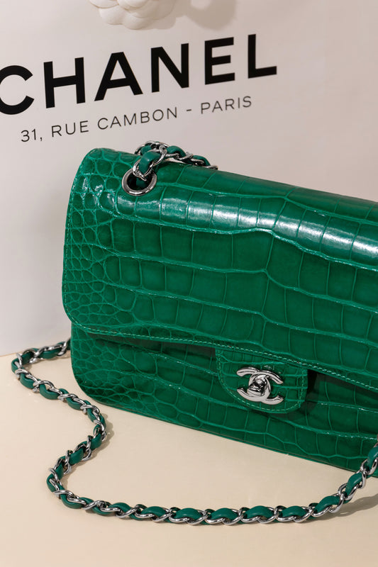 حقيبة شانيل متوسطة الحجم من جلد التمساح باللون الأخضر ذات الغطاء المزدوج