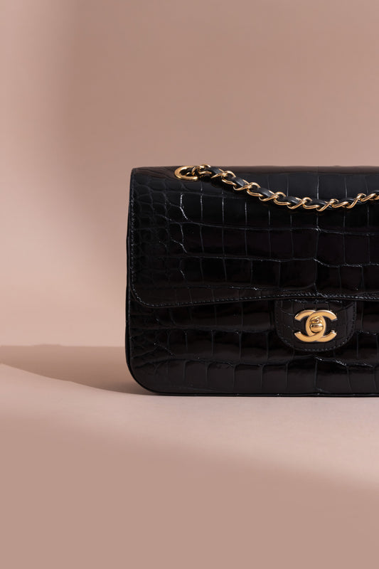 حقيبة شانيل الكلاسيكية متوسطة الحجم ذات الغطاء المزدوج اللامع من جلد التمساح الأسود مقابل حقيبة صغيرة