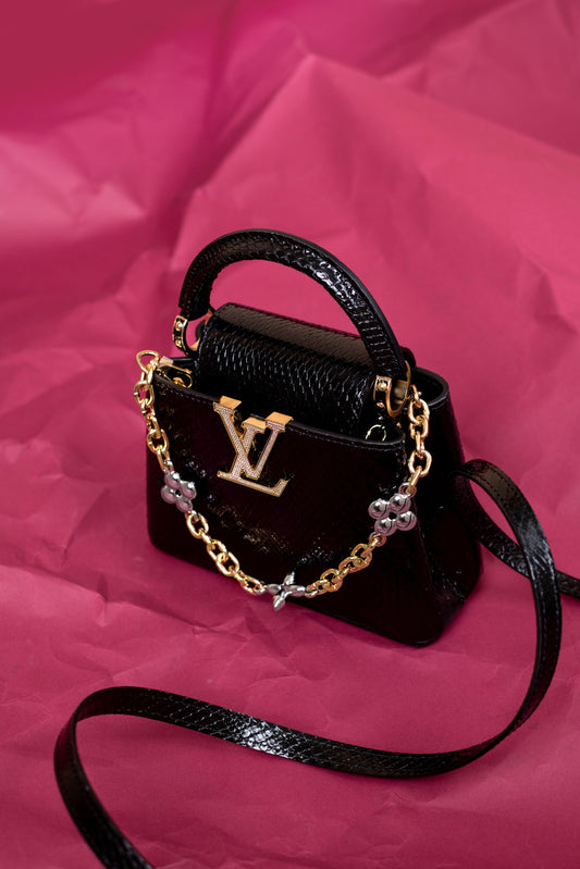 حقيبة لويس فيتون ميني كابوسين لامعة من جلد الثعبان الأسود مع سلسلة