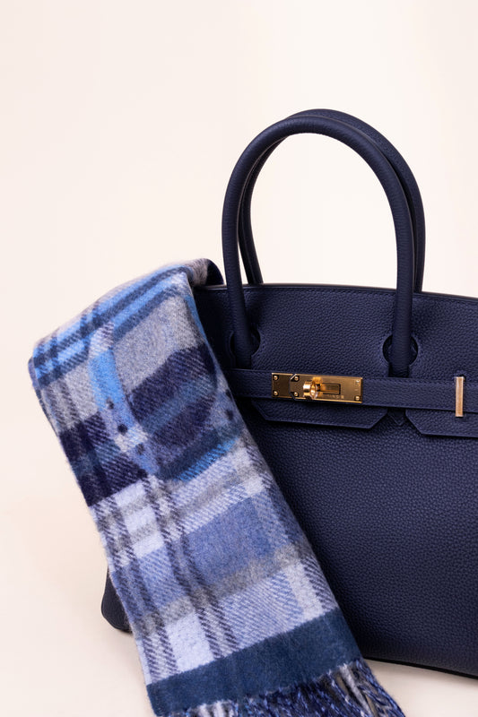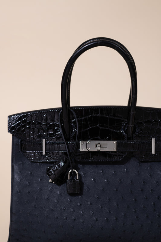 حقيبة هيرميس بيركين 30 تاتش من جلد النعام/جلد التمساح اللامع باللون الأسود/الأزرق النيلي PHW
