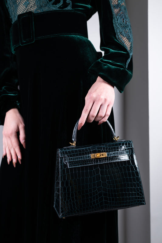 فستان هيرميس كيلي 25 لامع من جلد التمساح الأخضر مع قماش مخملي أخضر داكن من كوستاريلوس