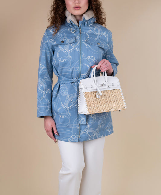 حقيبة هيرميس بيركين 25 بيكنيك باللون الأبيض الطبيعي/الجديد مع باركا "إبيرون دور فينيس" باللون الأزرق القطبي