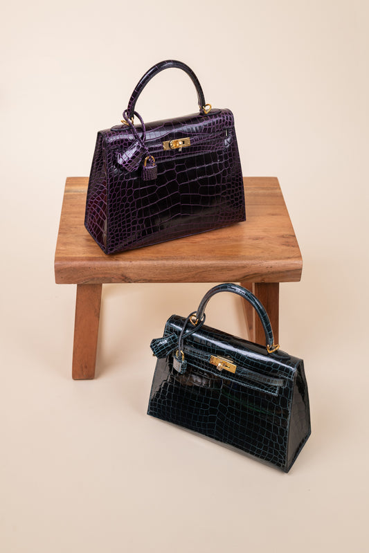حقيبة هيرميس كيلي 25 من جلد التمساح اللامع باللونين الكاسي والأخضر السرو GHW
