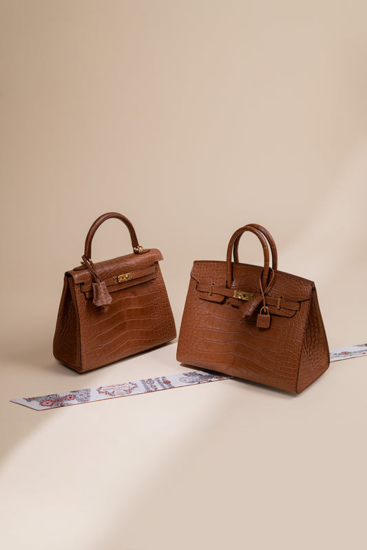 حقيبة هيرميس كيلي 25 وبيركين 25 من جلد التمساح غير اللامع باللون الذهبي GHW