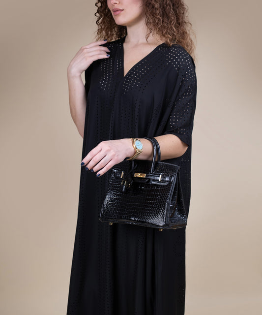 فستان آنا رادو ماكسي بتفاصيل الكاب مع حقيبة كيلي من هيرميس باللون الذهبي