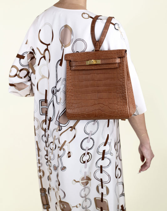 حقيبة ظهر هيرميس كيلي أدو باللون الذهبي التمساحي غير اللامع GHW