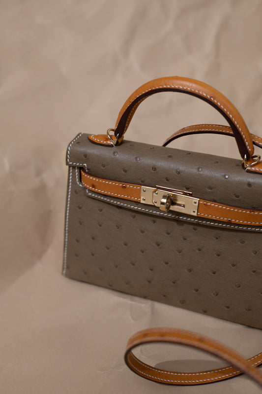 حقيبة هيرمس ميني كيلي 20 سم من جلد النعام باللونين الأبيض والذهبي مع شعار GHW